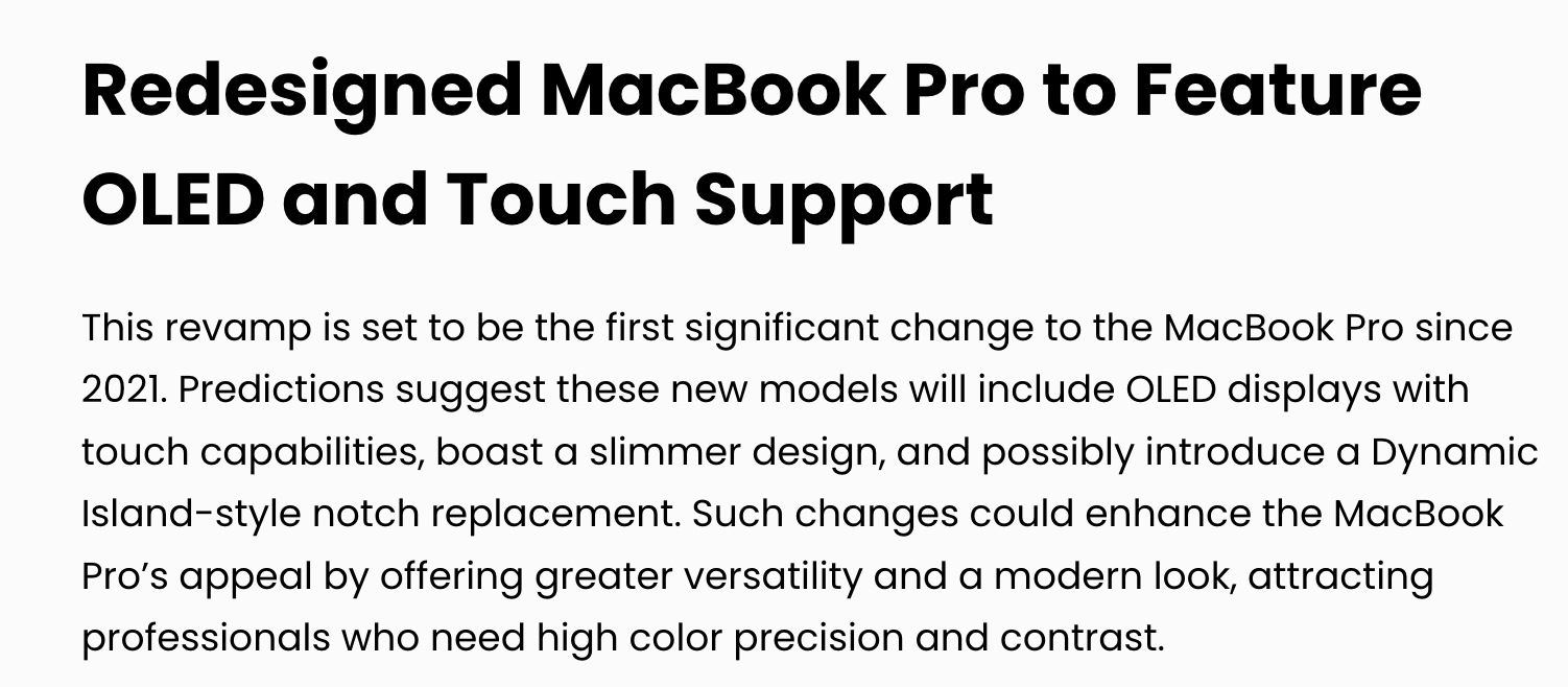 根据目前爆料,此次改款或将是一次重大升级,多项关键特性有望给用户带来全新体验。显示屏方面,新MacBook Pro将采用支持触控功能的OLED显示屏,相较于现款所使用的Mini LED技术,这无疑是一次重大跃升。OLED显示屏以其出色的色彩表现、高对比度和快速响应速度等优势,在显示效果上有望实现质的飞跃,而触控功能的加入也将进一步拓展用户与设备的交互方式。