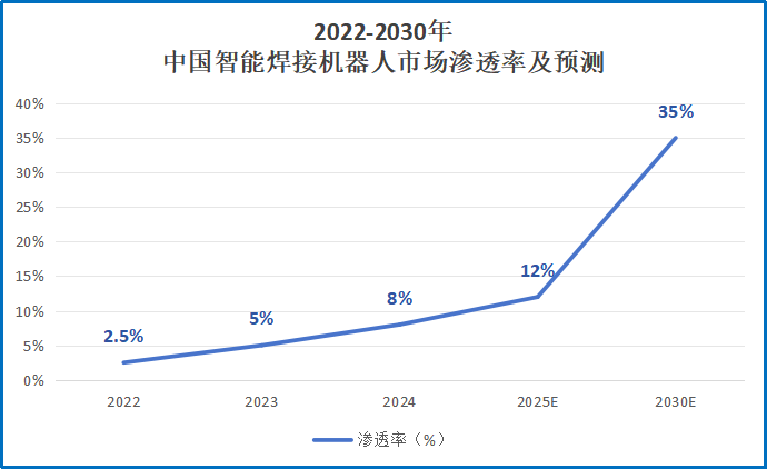 更重要的是,智能焊接机器人的市场前景也相当广阔。2024年,我国智能焊接机器人的市场渗透率还只有8%,但根据预测,这一数值到2030年将达到35%。