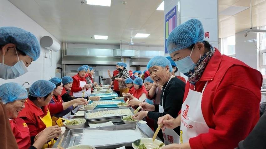 演出结束后,志愿者们马不停蹄赶往敬老院。食堂内,芹菜猪肉馅料鲜香四溢,大家围在一起,擀皮、包饺子。闫玉华的手指关节略显粗糙,动作却娴熟利落,一捏一折,一个元宝状饺子便成型了。
